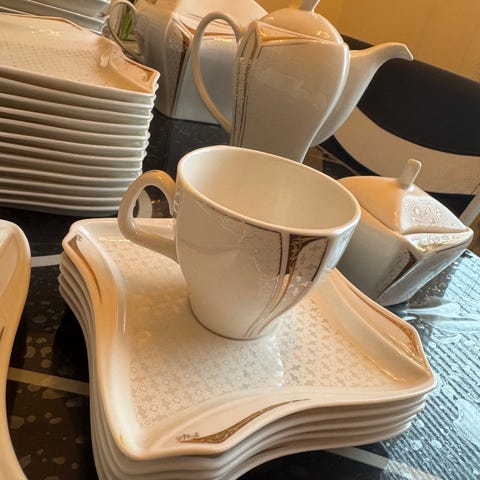 Grytan har en vit bas med ett brunt, detaljerat mönster som föreställer figurer och träd.