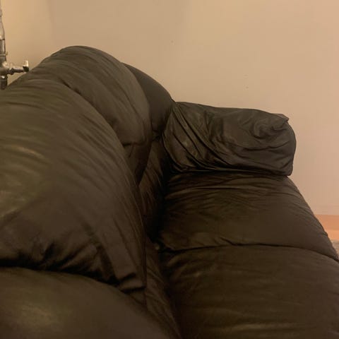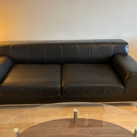 Min mamma säljer sin svarta skinnsoffa från Ikea. Den är 3-sitsig och har en sitthöjd på 45cm. Hon flyttar och önskar bli av med den snabbt.