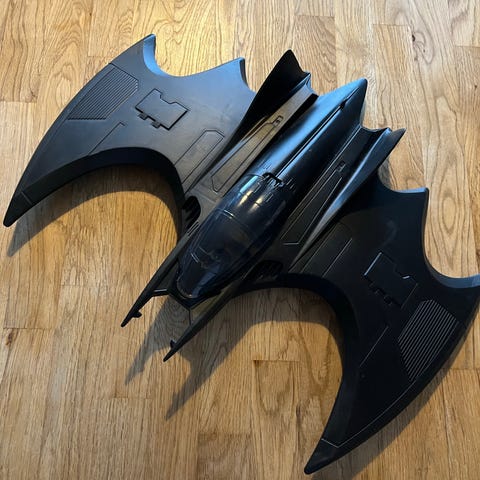 Batman radiostyrd motorcykel med figur i svart plast. Leksaken består av en motorcykel med fast monterad Batman-figur samt en separat handkontroll med två styrspakar. Produkten är avsedd som radiostyrt fordon för lek inomhus eller utomhus på släta underlag. Drivs med batterier (typ och antal framgår normalt av märkning på leksaken eller förpackningen). Passar för barn som vill köra och styra ett fordon med superhjälte-tema.