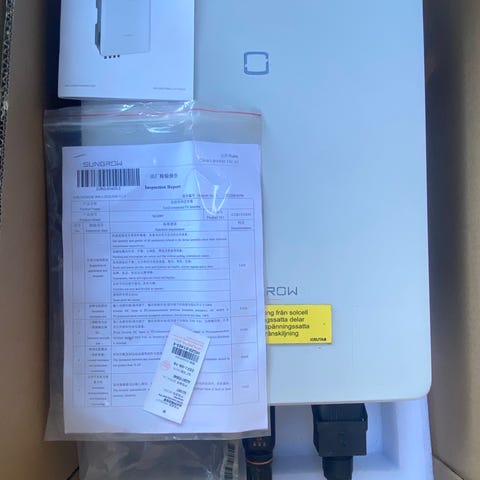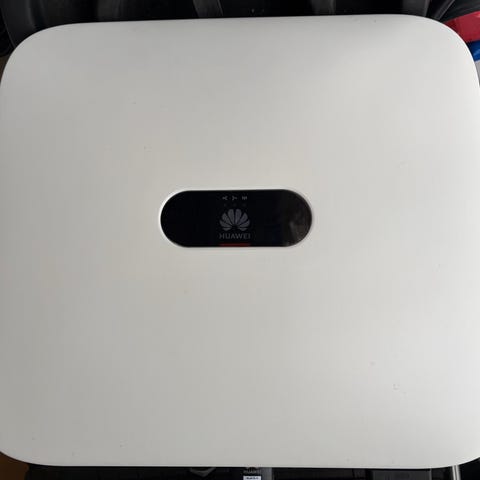 Huawei solcellsväxelriktare för nätanslutna solcellsanläggningar. Enheten är väggmonterad och har vit frontpanel med anslutningar i underkant för likströms- och växelströmskablar. På sidan finns märkplåt med teknisk information, serienummer och certifieringar. Växelriktaren är avsedd för utomhusbruk på fasad eller liknande underlag och används för att omvandla solpanelernas likström till växelström för hushåll eller annan fastighet. Enheten har inbyggda säkerhetsmärkningar och anslutningspunkter för installation av behörig elektriker.