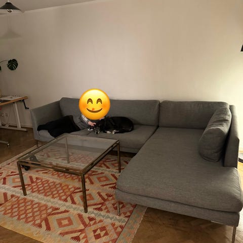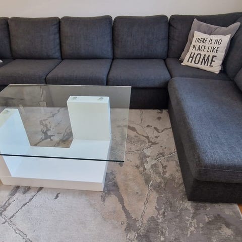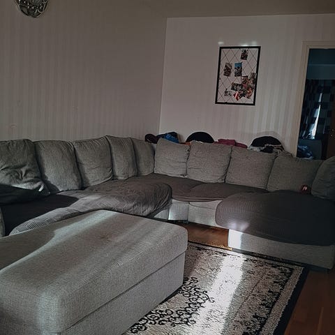 Hörnsoffa i grått tyg med schäslong och separat fotpall. Soffan är utformad i flera sektioner som bildar en rymlig hörnlösning med plats för flera sittplatser. Använd men bra skick följer med 3 stora överdrag . Bara dammsugat