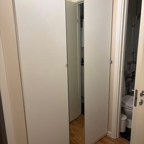 Två spegel och 3 högblanka vita 236x50 dörrar med gångjärn i dörren, behövs köpas den andra delen för att fästa i skåpet.