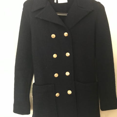 Kort, dubbelknäppt stickad jacka i 100% ull från tidlösa Busnel. Rak i modellen med två utanpåliggande fickor. Säljes i mycket gott skick då den är nästan helt oanvänd (fickor fortfarande igensydda).
