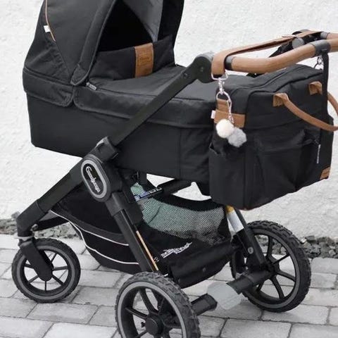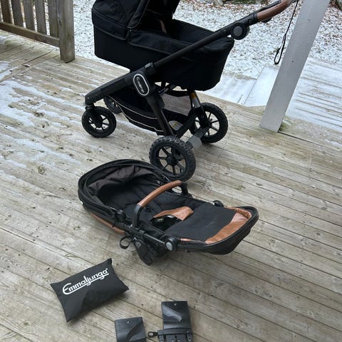 Emmaljunga NXT90, outdoor, svart (lite åt det svartgrå hållet). Det är en special edition färg som bara outdoor modellen hade. Liggdelen är i nyskick. Sittdelen är i fint använt skick. Lite solblekt på insidan av suffletten. Tyget på sittdelen är i väldigt fint skick. Likaså winterliningen. Skav på ramen som det blir vid användning. Handtaget har lite slitningar. Vi har satt skydd på för att minska det. Luftdäck.