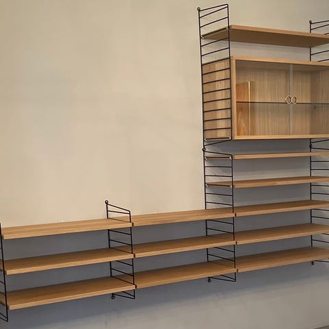 String hyllsystem i vitt formgivet av Nils Strinning. Tre golvgavlar och 12 hyllplan. Jättebra skick. Hämtas i Hökarängen :)