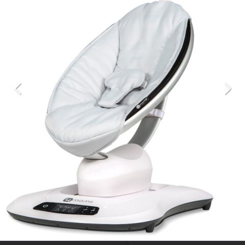 babysitter med elektrisk gungfunktion. Modellen har en vadderad sits i svart och vitt tyg med fempunktssele för barnet. På basen finns en kontrollpanel för att justera rörelsemönster, hastighet och ljudvolym. Babysittern drivs med nätadapter som syns på bilden. Passar för spädbarn enligt tillverkarens rekommendationer och kan användas som viloplats eller lugnande gung för barnet i hemmet.