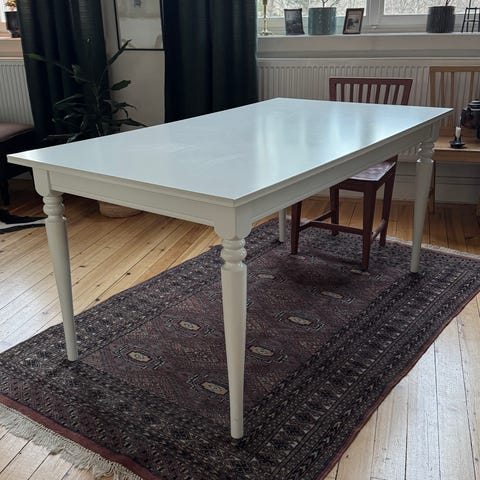 Varsamt använt bord med vissa små märken som knappt syns. Som minst för 4 personer och utdraget har vi suttit 6 vuxna och 4 barn.