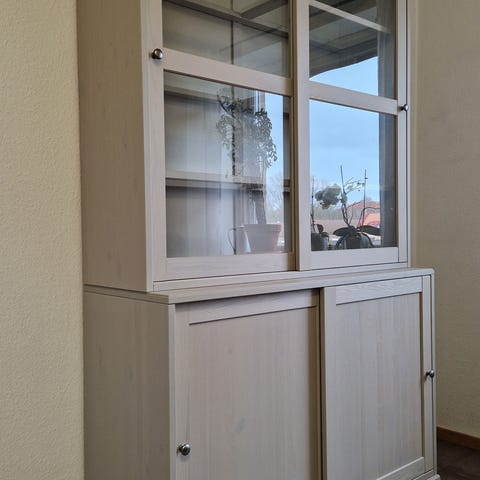 Två separata jalusiskåp/arkivskåp från 1950-talet som målats för att passa samman. Total höjd 210 cm. Måttet på övre skåpet är 135x100x40 cm h.b.d och för det undre 74x120x42,5 cm h.b.d. Skåpen är målade en mörkt brunröd äggoljetempera polerad till fin glans, invändigt i en gröngul kulör. Benen är målade med linoljefärg. I fint skick men jalusiet för nedre delen är lite trögt. Rymmer massor med förvaring! Säljs ihop. Hämtas i Ormaryd.