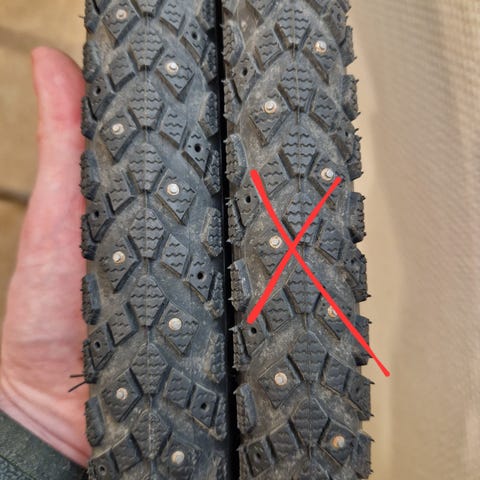 Två dubbdäck där många dubb saknas. Grovt mönster. 28 tum. 150:- för båda.