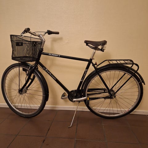 Damcykel av Sjösala "Amanda" ramstorlek 51 cm och 28"/700c-hjul. Cykeln har lågt insteg anpassat för kvinna, kedjeskydd, pakethållare bak samt korg framtill. Färgen är svart. Passar för vardagscykling på väg och cykelbana.