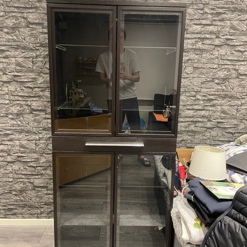 Säljer vitrinskåp i svart trä med 3 skjutdörrar i glas.