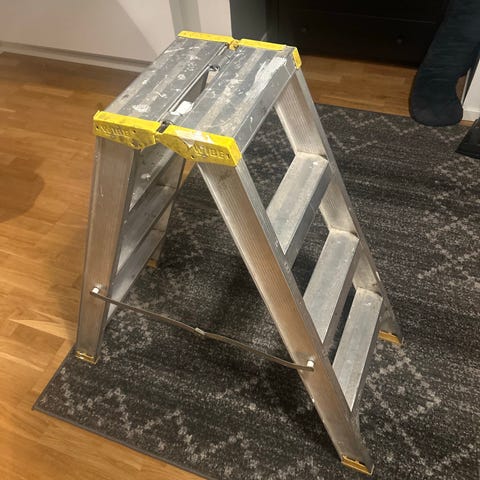 Wibe W 55 TP-3 stege i aluminium. Stegen är fristående med plattform och stödben, avsedd för arbete inomhus eller utomhus där en stabil arbetsplattform behövs. Informations- och säkerhetsdekaler finns på sidan av stegen med angivna användnings- och säkerhetsinstruktioner. Passar för exempelvis arbete i hemmet, garage eller verkstad där en kompakt och hopfällbar stege är praktisk.