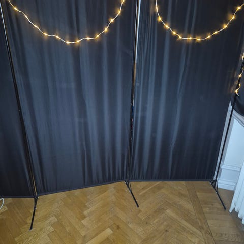 Jag säljer skärmvägg från IKEA, 80x195 cm, två stycken, med kopplingsbeslag och ben för rumsavdelning. Allt i mycket bra skick.