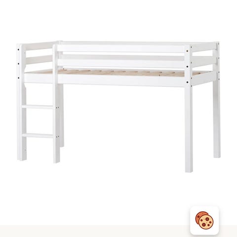 Jollyroom loftsäng för barn i vit färg. Sängen är upphöjd med stege på sidan och har utrymme undertill med inbyggt skrivbord Tillverkad i stabil konstruktion med skyddande sängram runt liggytan för ökad trygghet för barnet.