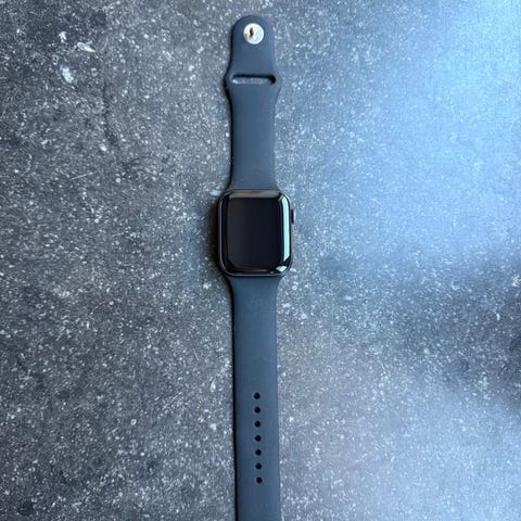 Apple Watch smartklocka med svart sportarmband. Klockan har utbytbara armband och magnetisk laddningskabel som ansluts på baksidan. Lämplig för vardagsanvändning med funktioner som aktivitetsmätning, aviseringar och tidsvisning beroende på installerade appar och inställningar.