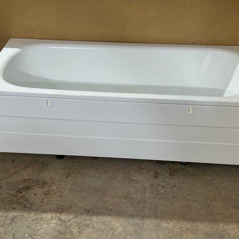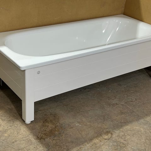 Badrumsinredning badkar, handfat, termostatblandare, handdukstork, badrumsskåp.