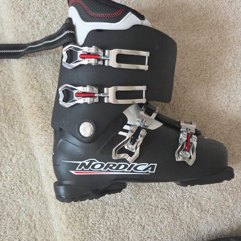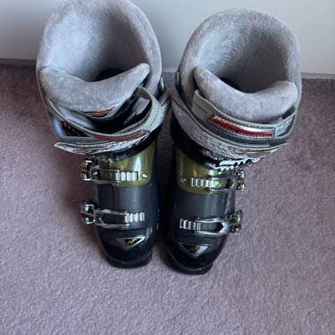 Lange RXJ alpina pjäxor i svart med gula detaljer. Modellen har fyra justerbara spännen och kraftig rem upptill för stabil passform. Sula med greppvänligt mönster för gång på hårt underlag. Passar för alpin skidåkning. Storlek 24,5. Flex 65, bra för barn/ungdom
