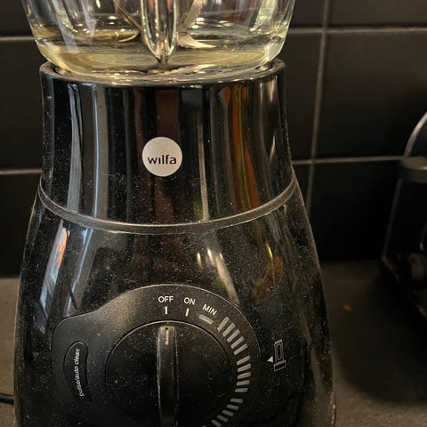 Wilfa blender med behållare i glas och bas i rostfritt stål.