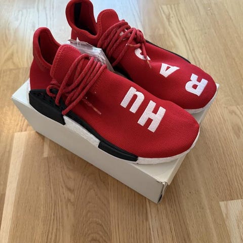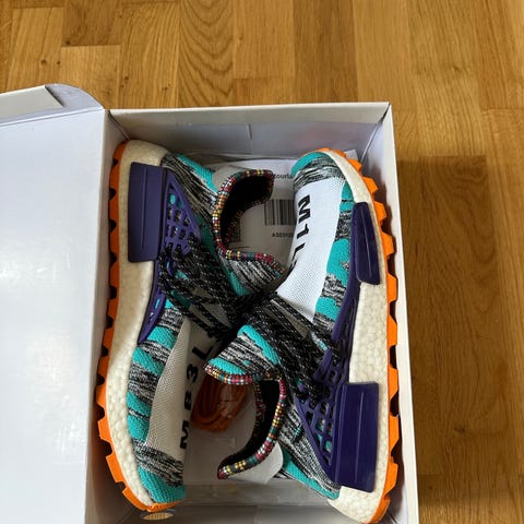 Adidas human race NMD sneakers i storlek 42. Skorna har en flerfärgad ovandel i textil med rosa, lila och vita toner samt snörning med lila skosnören. Mellansulan är i vit dämpande sula och yttersulan är i gummi. Modellen är låg och lämpar sig för vardagsbruk och lättare träning.