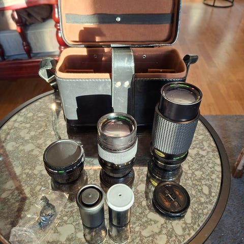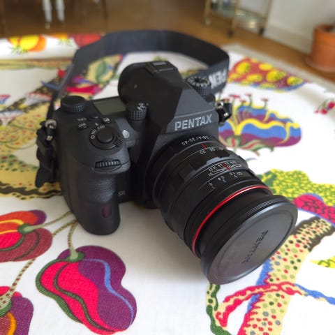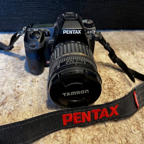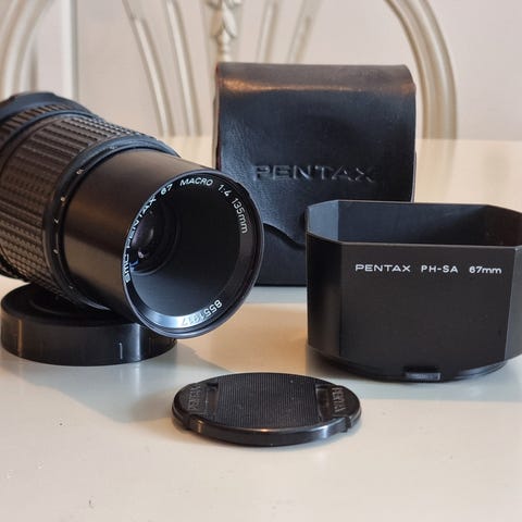 Pentax digital systemkamera med flera objektiv och tillbehör. Utrustningen inkluderar kamerahus, utbytbara objektiv, kameraväska/ryggsäck, motljusskydd, filter och övriga fototillbehör enligt bilderna. Passar för allmän fotografering, resor och naturfoto där behov finns av flexibel brännvidd och extra tillbehör. Alla delar är anpassade för Pentax digitalt kamerasystem.