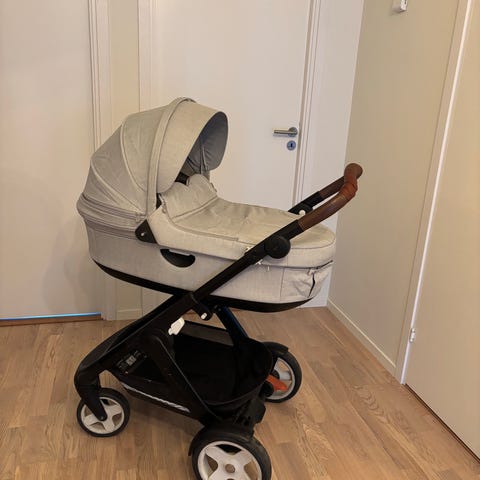 Petite Cherie barnvagn med både liggdel och sittdel. Liggdel med ljus insida och madrass, samt yttertyg i mörk färg. Sittdel med sele och bygel, monterad på chassi med fyra hjul. Handtag och bygel har överdrag i mörkbrunt material. Vagnen är lämplig för spädbarn i liggdel och större barn i sittdel. Passar för vardagsbruk och promenader i stadsmiljö.