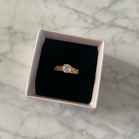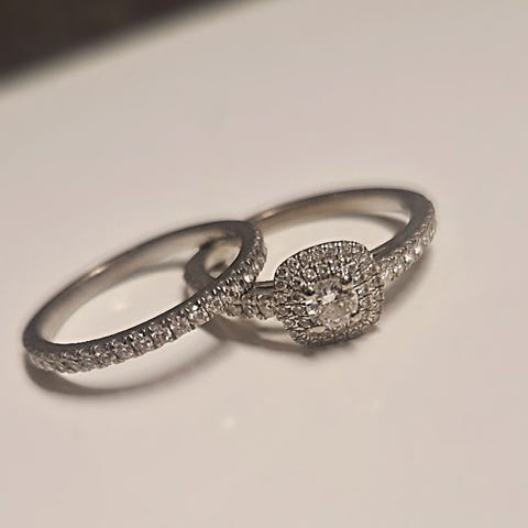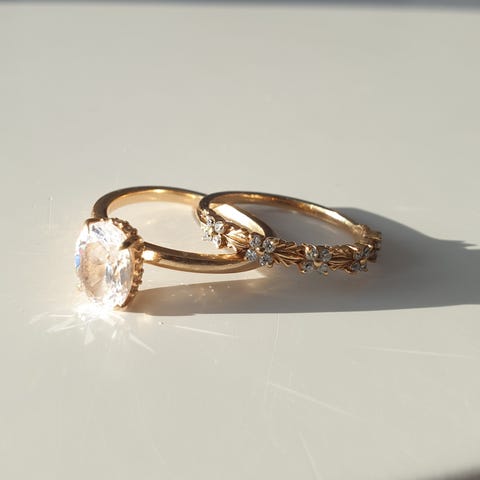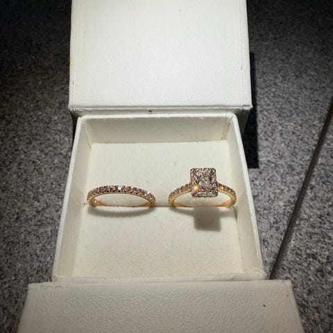 Ett vackert guld ringset med gnistrande stenar (vet ej vad det är för stenar. Setet består av två ringar som kan bäras tillsammans eller separat. Perfekt för giftemål och förlovning.