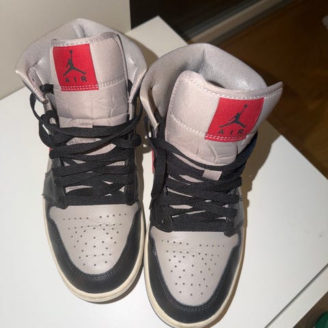 Jordan basketsskor i storlek 40. Modellen är mellanhög med snörning och gummisula. Skorna är huvudsakligen svarta med röda detaljer och vit mellansula. Passar för basketspel och annan inomhus- eller fritidsaktivitet där stabilitet och grepp önskas.