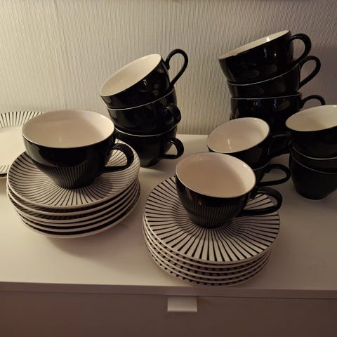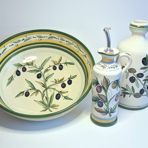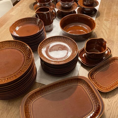 Terracotta servis från La Poterie Provence France i jordnära toner.
