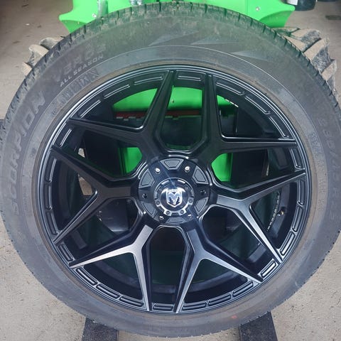 Ram 1500 Classic original fälgar med godkända året runt däck. Snöflinga symbol på däcken. Skicken på däcken är ca 6 mm kvar. Fälgarna är bra skick. Suttit på en Ram 1500 classic generation 4 2021.