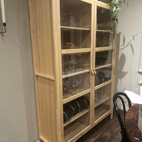 Snyggt vitrinskåp som betsats om i en fin mörk nyans och fått nya beslag. Tre hyllor i glas och belysning som kontrolleras via strömbrytare under skåpet. Mycket fint skick!