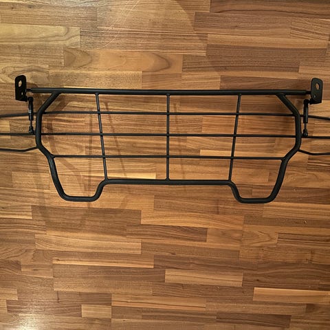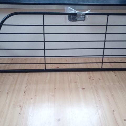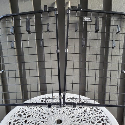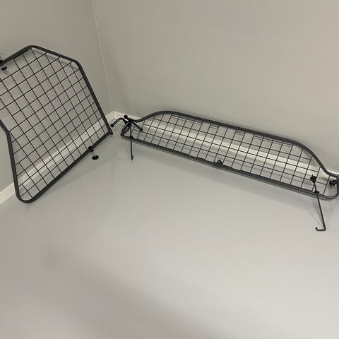 Hundgaller och lastgaller för bil i svart metall. Består av ett övre galler för montering bakom baksätet samt två nedre sektioner som kan användas som avdelare eller grindar i bagageutrymmet. Gallret är avsett för att skapa en avskild yta i bagaget, exempelvis för transport av hund eller last. Monteras i bilens bagageutrymme och ger en stabil avgränsning mellan kupé och lastutrymme.