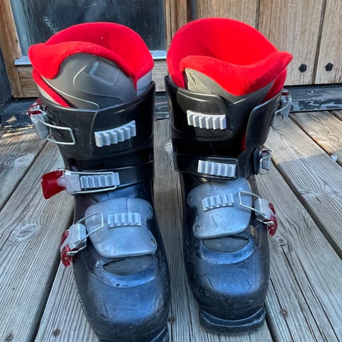 Skidpjäxor för barn i svart och röd färg. Modellen har två justerbara spännen i metall. Mjuk, röd innerfoder ger komfort och isolering.