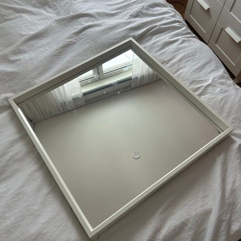IKEA speglar i flera olika modeller och storlekar. På bilderna syns rektangulära speglar samt en åttakantig spegel. Speglarna har olika ramar och kan användas i exempelvis hall, sovrum eller vardagsrum. Passar för väggmontering där extra spegelyta önskas. Stycket kostar 100 kronor.
