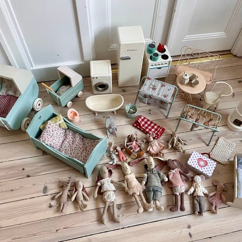 Maileg kaniner och mjukdjur med kläder. Setet omfattar flera tygkaniner i olika storlekar samt mindre mjukdjur. Flera plagg och accessoarer i tyg ingår, bland annat klänningar, shorts och toppar i olika färger och mönster. Passar för lek, samling och inredning i barnrum.