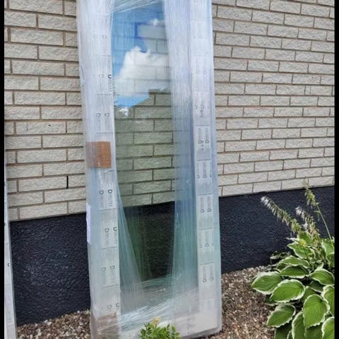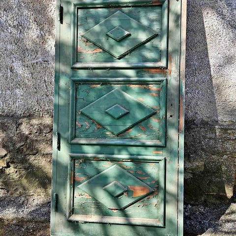 Den är från 80 tall,har inga fuktskador då den var skyddat av taket .Hela bredden med sidor lys är 180 cm därav sidor 2 x40cm och dörr med karm 100 cm. höjd 220 cm ,mycket dekorativ utsidan och TEAK materialet på insidor som bilden visar. Utsidan behöver ommålning eller