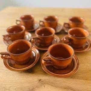 Koppar och fat 12 delar. Mycket fint skick! Vintage 70/80-tal. Troligtvis glaserad keramik. Kopp höjd 5,5 cm. Fat diameter 13,5 cm