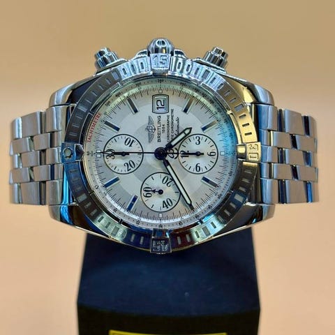 Breitling herrklocka med tvåtonslänk i stål och guld. Urtavla i ljus ton med kontrasterande subdials och datumvisning. Klockan har kronograffunktion med flera mindre urtavlor för tidtagning. Boett och länk är utförda i metall med polerade detaljer. Levereras med Breitling-förpackning och tillhörande dokumentation enligt bilderna. Passar som armbandsur för herr.