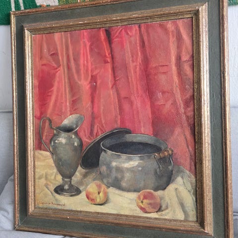 Tavla med stillebenmotiv föreställande köksföremål, bland annat tratt och kärl, i varma färger. Målningen är inramad med en dekorativ träram och har upphängning med snöre på baksidan.Konstnär Bertil Öman.Storlek 25x25 cm.