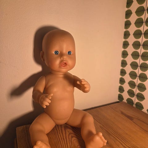 Säljer fina Miniland-docka på 34 cm. Dockan har aldrig blivit använd till lek, utan har bara legat undan, så den är i princip som ny. Den kommer med söta stickade kläder som gör den extra charmig.