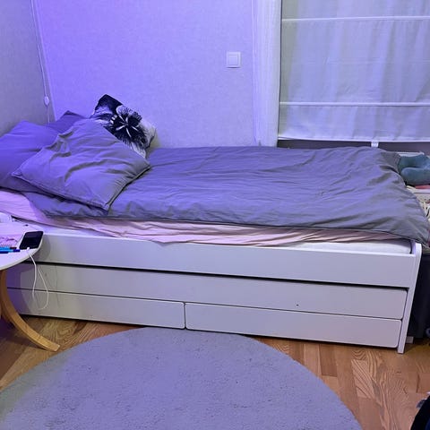 90cm vit enkelsäng med ribbotten och utdragbara förvaringslådor undertill. Lådorna under sängen ger extra förvaringsutrymme för till exempel textilier eller leksaker. Passar som vanlig säng i sovrum eller barnrum.