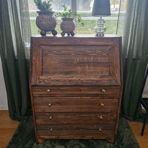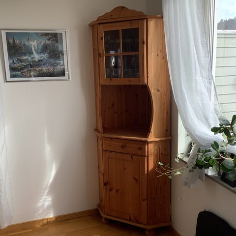 Sekretär bokhylla i furu med vitrindel. Överdel med glasdörrar och hyllplan för förvaring av böcker eller prydnader. Underdel med nedfällbar skrivskiva och mindre fack för papper och kontorsmaterial samt lådor nertill. Passar som arbetsplats eller förvaringsmöbel i vardagsrum, sovrum eller arbetsrum.