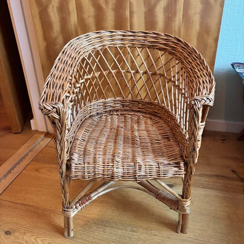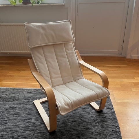 IKEA barnfåtölj med stomme i trä och ljus klädsel. Fåtöljen är anpassad för barn och har en lätt lutande sits och hög rygg för bekvämt sittande. Klädseln är vadderad och fäst över ramen. Passar i barnrum, lekrum eller vardagsrum som sittplats för barn.