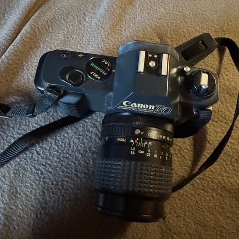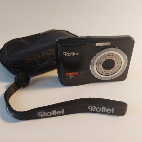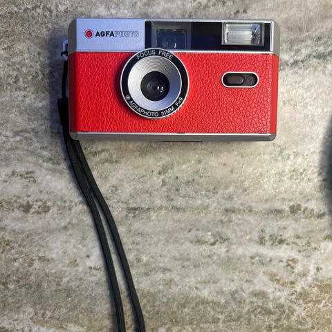 Canon Prima kompaktkamera i röd plastkonstruktion. Kameran är en analog 35 mm kompaktkamera med inbyggd blixt och enkel reglage för exponering och blixtläge på framsidan. Baksidan har lucka för film och sökare, samt fönster för filmstatus. Undersidan har gänga för stativfäste. Passar för 35 mm filmfotografering vid vardagsbruk och resor.
