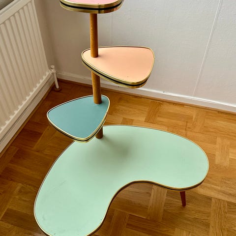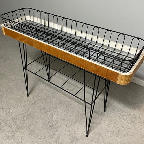Blombord i string—modell med teakfanér. Stomme i trådmetall med svart plastöverdrag.