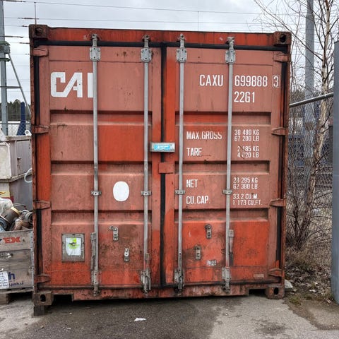 Lindby HP-FLEX-40 fraktcontainer i stål med längd 40 fot. Containern är beige och utrustad med dubbeldörrar framtill med låsbara stänger. Märkplåten visar typ HP-FLEX-40 och CSC-säkerhetsgodkännande för transport under tullplombering. Lämplig som lagrings- eller transportcontainer för olika typer av gods där väderskyddad och låsbar förvaring behövs.