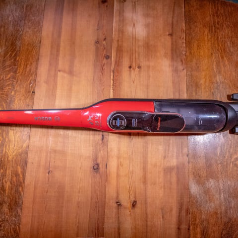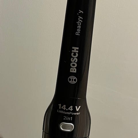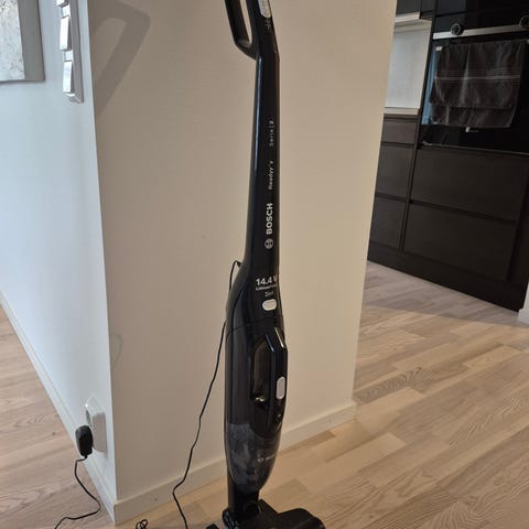Bosch sladdlös skaftdammsugare i vit färg. Har tre olika nivåer, högsta nivån 3:an så tar batterit snabbt slut, nivå 2 fungerar att dammsuga i cirka 10-15 min och nivå ett längre. Därav priset. Annars dammsuger den bra,.