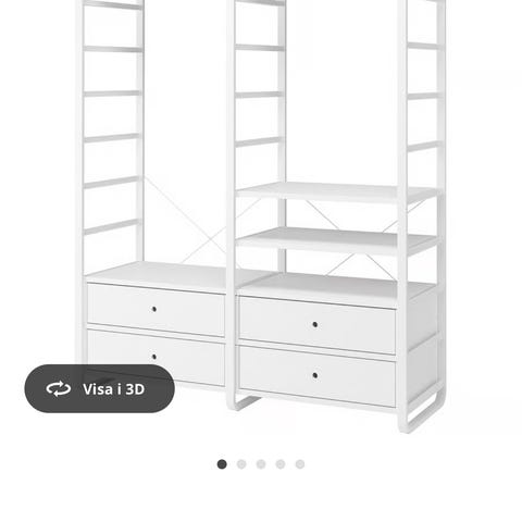 Vit med hyllplan i svart, repor på hyllorna finns.