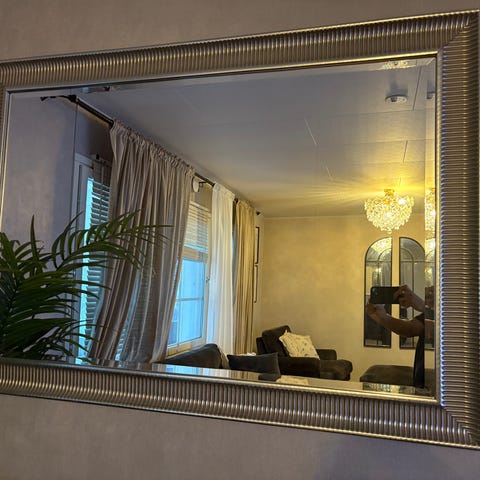 Spegel med rektangulär form och silverfärgad ram med dekorativ kant. Passar för väggmontering i exempelvis hall, sovrum eller vardagsrum. Spegeln ger en klar spegelbild och kan användas både som praktisk spegel och som inredningsdetalj.