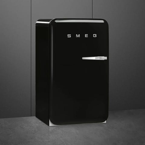 Smeg kylskåp i svart utförande. Fristående modell med frontöppning och invändig belysning. Utrustad med flera hyllplan och dörrfack för förvaring av dryck och matvaror. Passar exempelvis i kök, kontor eller som extra kyl för drycker.
