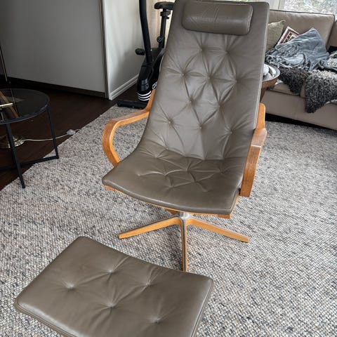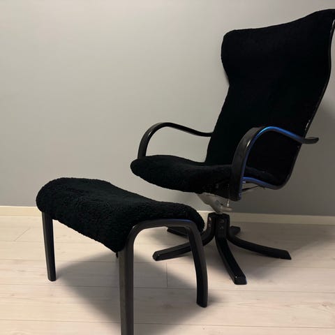 Fåtöljer med fotpallar i grått fårskinn och oljad björk